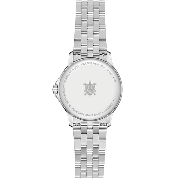 Женские часы Certina DS‑8 Lady C014.410.16.011.00 выполнены в корпусе из нержавеющей стали 316L диаметром 31 мм, толщиной 7,95 мм. Модель относится к линейке DS (Double Security) — фирменной конструкции Certina, предусматривающей сапфировое стекло, усиленные уплотнения на заводной головке и задней крышке, что обеспечивает повышенную устойчивость к ударам и влаге.