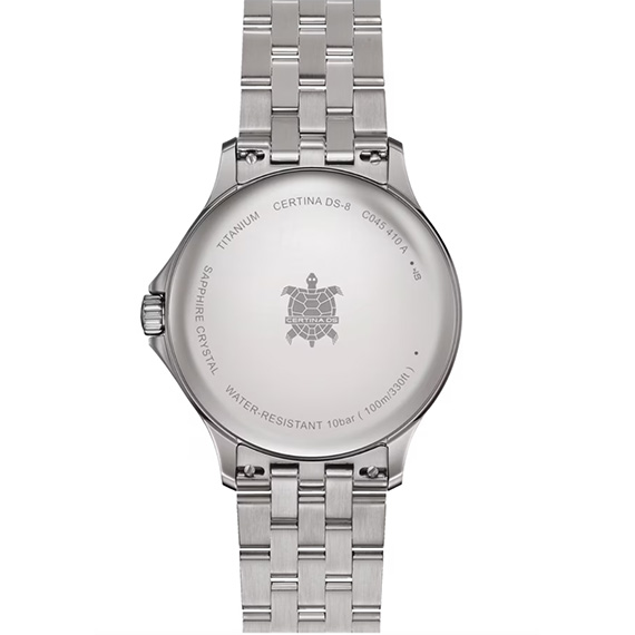 Мужские часы Certina DS-8 Gent C045.410.44.041.00 выполнены в корпусе из титана диаметром 40 мм и толщиной около 8,35 мм.Модель относится к коллекции DS (Double Security) — фирменной системе Certina, предусматривающей сапфировое стекло, уплотнители на заводной головке и задней крышке, усиленную конструкцию корпуса.
