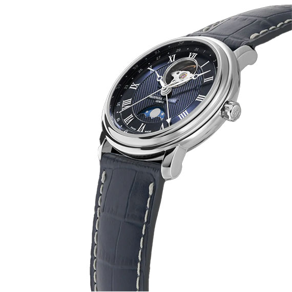 Frederique Constant Classics FC‑335MCNW4P26 — сочетание классической элегантности и технической изящности: “открытое сердце” циферблата показывает работу механизма, фаза Луны добавляет поэтичности, а синий дизайн придаёт глубину и характер. Хороший выбор для тех, кому важны швейцарское качество, художественная отделка и универсальность — часы подойдут как для официального, так и для повседневного образа.