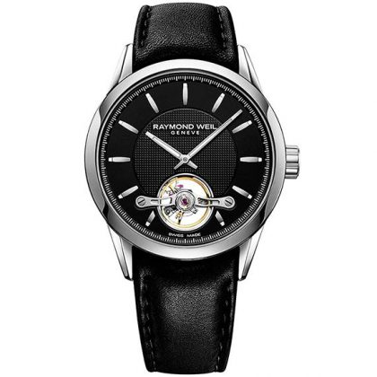 Циферблат — чёрного цвета, с тонкими часовыми метками и стрелками.
