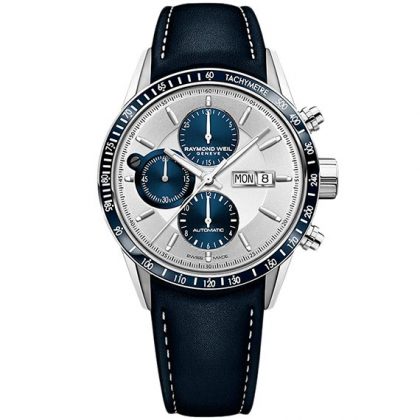 Циферблат серебристого цвета с арабскими цифрами и минутной разметкой; метки и стрелки покрыты люминесцентным составом для удобного чтения при слабом освещении. Модель оснащена функцией хронографа — три счётчика, а также окном даты. Безель — фиксированный, из стали, подчёркивает строгий и универсальный стиль.