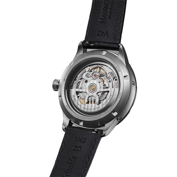 Циферблат защищён сапфировым стеклом с антибликовым покрытием, а прозрачная задняя крышка позволяет наблюдать отделку механизма.