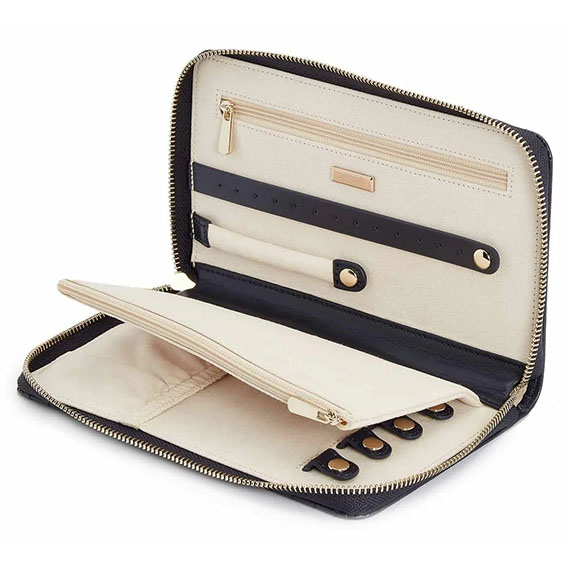 WOLF Maria Jewellery Portfolio 766417 — элегантная дорожная шкатулка-органайзер для ювелирных украшений, часов и аксессуаров из коллекции Maria бренда WOLF 1834. Эта модель сочетает минималистичный и изысканный дизайн, продуманную организацию внутреннего пространства и защиту изделий от окисления, что делает её идеальным аксессуаром для путешествий и повседневного использования.